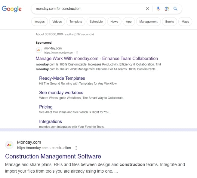 One of the key benefits of running Google Ads (even if you’re a SEO pro who’s ranking in the first spot) is that you choose what your leads see. Google has its own criteria for deciding which pages it will display to leads in the standard search engine experience. This can sometimes mean outdated landing pages, content that’s not exactly optimised for conversion, and so on. When you run Google Ads, on the other hand, you’re able to tailor your offer to the type of leads you are hoping to attract. You can send them to newest landing pages, offer them special perks, and more. Consider this example from Monday.com. The first image is their paid ad, and the second is the page that Google serves for the “Monday.com for construction” query. Can you spot the difference? The organic page can only entice the visitor with the meta description, something that Google often generates on its own. On the other hand, the paid ad offers more reasons to actually purchase Monday.com - including templates, enhanced team collaboration, pricing, integrations, and more!