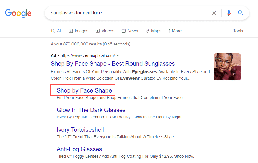If leads are searching for sunglasses by face shape, they want an ad that offers the option: