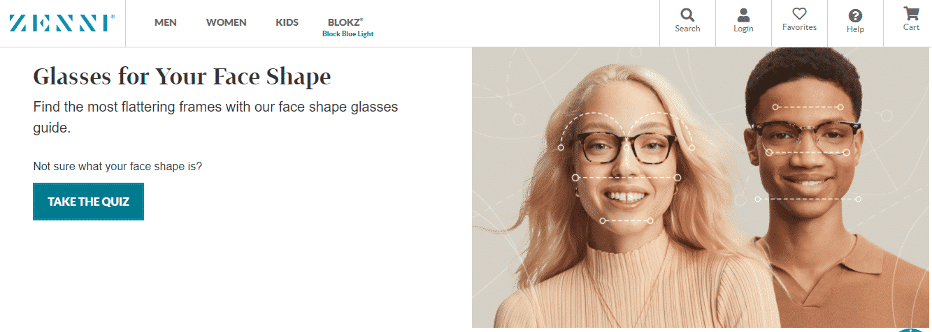 If you want to engage your visitors right away, consider the example above. Zenni Optical uses an interactive quiz to help visitors determine their face shape so they can start shopping right away.